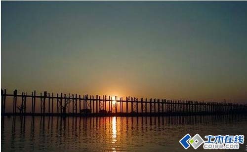 缅甸乌本桥,是世界上最长的柚木桥,长度近1.5公里,横跨东塔曼湖,长达1200米,是世界上最长的柚木桥。桥墩、桥梁、铺桥的木板都是用珍贵的柚木。桥柱与桥柱之间相距3米远,桥柱有1000多根。整座桥相接处没有使用一颗铁钉,全靠斗榫。这座桥已经历经150年的风风雨雨,但是依然结实。从桥墩到桥面及护栏,全部采用珍贵的柚木,历经百年而不朽。风雨的冲刷洗涤,日光的投射照耀,木头已呈浅灰色,作为游览的景点,更作为当地百姓每日过往的交通路径,至今它仍坚固地屹立在东塔曼湖中。