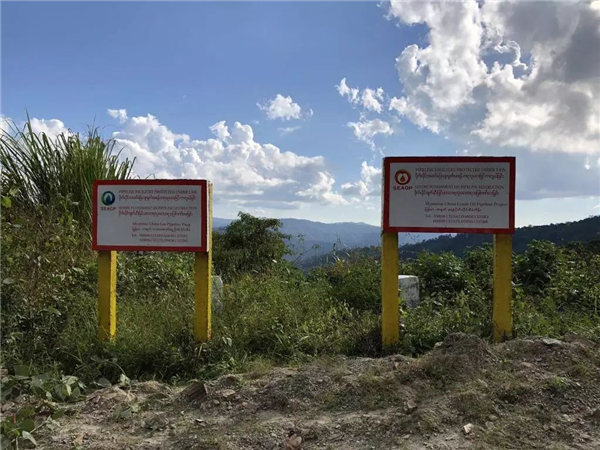 ●中缅油气管道经过区域上竖立的标牌,用英缅双语写着“管道设施受法律保护,对管道破坏给予严厉处罚”字样 / 张梦圆