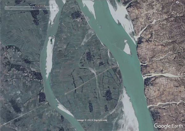 ●伊洛瓦底江”穿越”为中缅油气管道最为艰难的工程段之一,管沟在大地留下空中可见的印迹(摄于2014年1月12日) / Google Earth