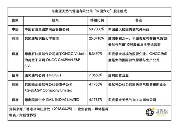 “东南亚天然气管道有限公司”则是由“四国六方”持股,中石油持有50.9%股份,韩国浦项钢铁大宇集团持有25.041%股权,印度石油天然气公司通过旗下负责国际油气探勘的子公司持有8.347%股权,缅甸油气公司持有7.365%股权,印度最大天然气加工销售企业GAIL与韩国垄断企业韩国天然气公社各持有4.1735%股份。