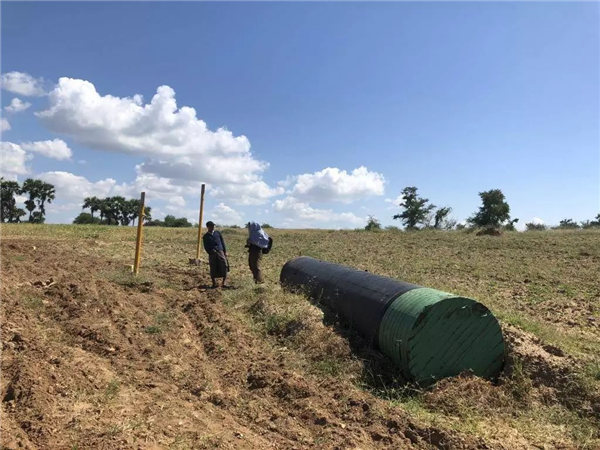 ●马圭省唵培地区芝芃村的灌渠由于管道建设受到损害,省政府拨款修理水渠,村民后方为用于连接两侧山谷水道的铁架 / 张梦圆