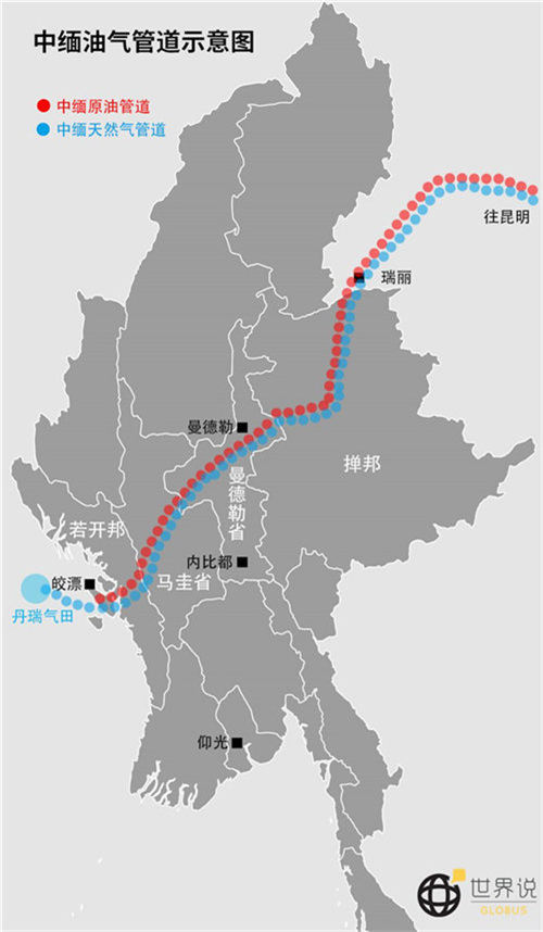 中缅天然气管道始从皎漂港,原油管道起自马德岛,随后并行建设,从云南瑞丽58号界碑进入中国。