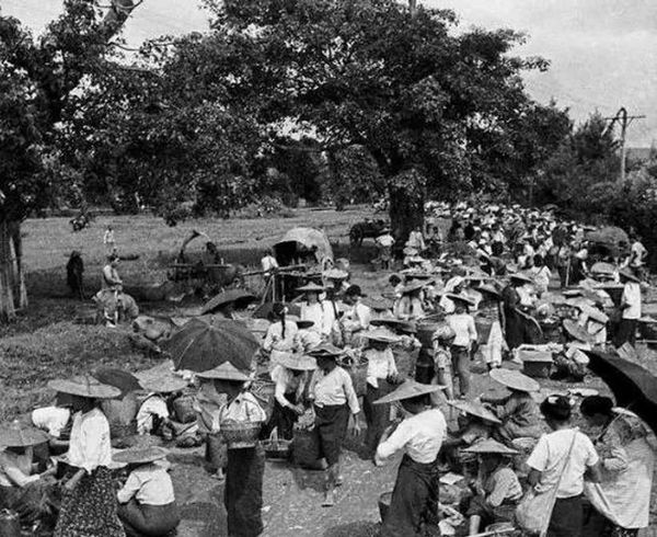 1971年,瑞丽县弄岛乡,傣族赶街,长长的集市街上交易着各色商品