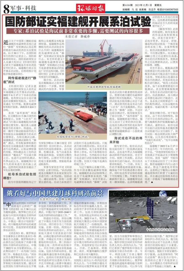 《环球时报》记者注意到,这是国防部发言人首次证实福建舰正在开展系泊试验。2022年6月17日下水命名的福建舰,是我国完全自主设计建造的首艘弹射型航母,采用平直通长飞行甲板,配置电磁弹射和阻拦装置,满载排水量8万余吨。