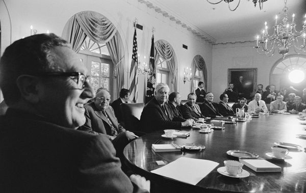 ||基辛格与美国两党领导人以及尼克松总统坐在白宫内阁会议室