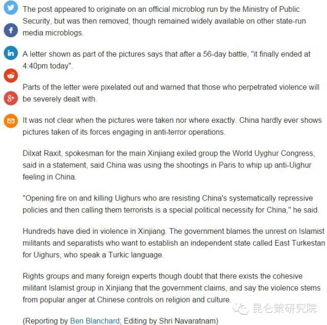 武装分子袭击巴黎饭店、音乐厅和体育场的事件发生后不到1天,路透社就炮制了这篇报道,该报道前半段貌似公允的描述事件的发生,而后半段却“卒章显志”——该媒体竟然引用境外的反华分裂组织“世界维吾尔代表大会”(简称世维会)发言人的话,称中国利用巴黎恐怖袭击来煽动国内的民族情绪。