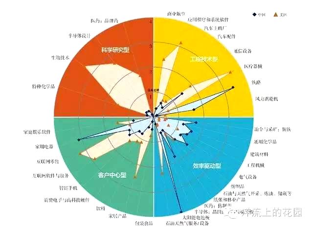 上图是中国和美国在33个工业领域的科技实力雷达图,目前,中国在家用电器、建材、铁路和高铁技术、风力涡轮机和电力设备、太阳能电池板和石油天然气设备等领域领先于美国,但其他20多项技术领域都差于美国,在商业航空器、半导体、生物机器、特种化工和系统软件等技术领域,和美国的差距在 20至30年左右。