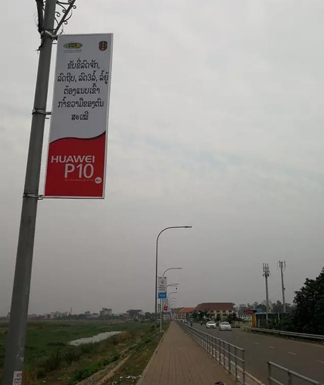 在老挝首都万象的高速公路边一路悬挂的中国企业标识