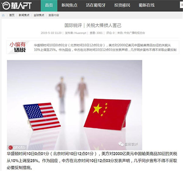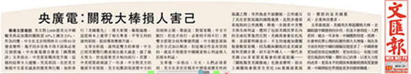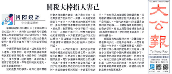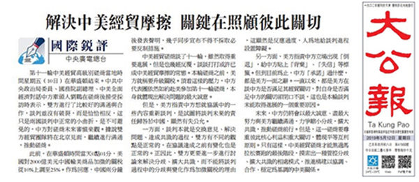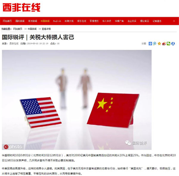 央视网消息:中央广播电视总台“国际锐评”5月9日、10日、11日连续刊播题为《谈谈打打,或许成中美经贸摩擦的常态》《企图利用台湾问题牵制中国的冒险必将是条死路》《关税大棒损人害己》《解决中美经贸摩擦 关键在照顾彼此关切》等4篇有关中美经贸摩擦评论文章。众多境外媒体和网站陆续转发。