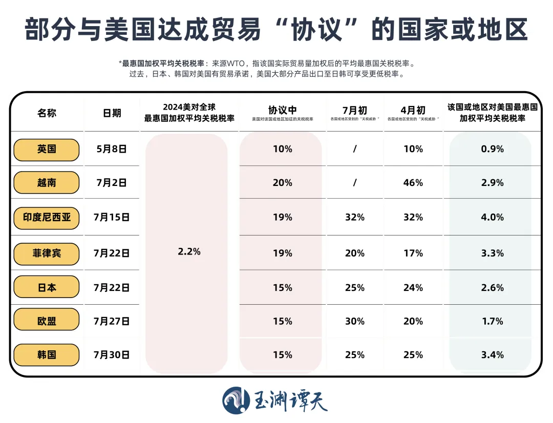 这些达成协议的国家所面临的关税,相较于4月2日美国实施的“对等关税”,确实是降下来了。但如果跟今年以前的状态比,还是高了不少。