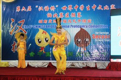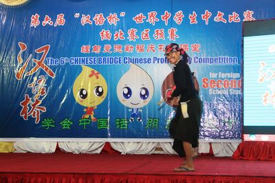 2013年6月16日,上午9时,中国驻曼德勒总领事馆主办,曼德勒福庆孔子课堂承办的“学会中国话,朋友遍天下”为主题的“第六届汉语桥世界中学生中文比赛”,于“曼德勒酒店HOTEL MANDALAY”大礼堂内隆重举行。来自缅北地区腊戌、八莫、抹谷、彬乌伦、漫沾、东枝、皎脉、曼德勒等城市,20多所汉语教学机构的25位学生参赛。比赛分为多个环节:演讲比赛、汉语及中华文化知识笔试、已于昨日6月15日在福庆孔子课堂内举行,今日继续比拼才艺表演。参赛学生都是各所学校精选出来的优秀生佼佼者,因此比赛进行得十分激烈。