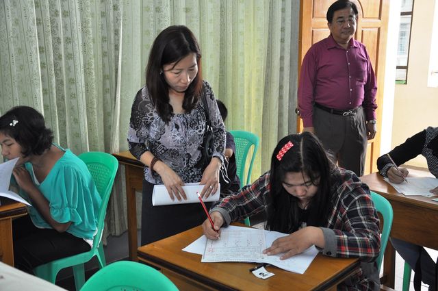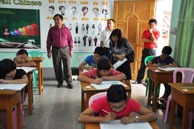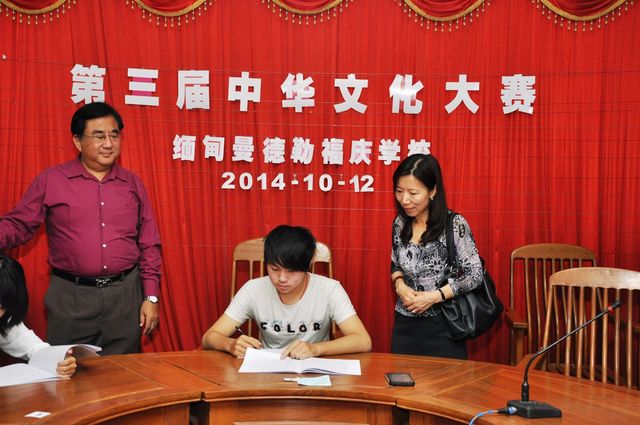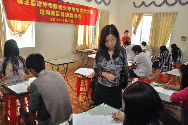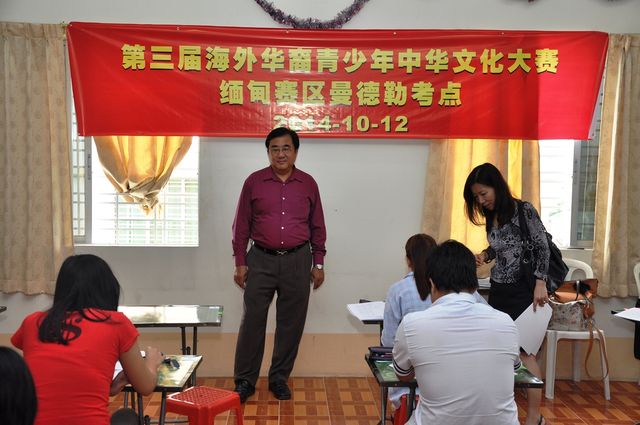 今日10月12日上午9时,缅北地区20余所华校及汉语教学机构同时举办第三届海外华裔青少年中华文化大赛。曼德勒、彬伍伦、腊戌、东枝、景栋、大其力、抹谷、丙弄、皎脉、八莫、啤谬、望濑。。。等缅北地区各华校的学生4400余人踊跃报名参加了今天的比赛。考试当天,中国驻曼德勒总领事馆靳仪麟副总领事到曼德勒福庆学校考试点,在校长及校领导们的陪同之下,视察了考生考试情况,并鼓励学生们再接再厉。