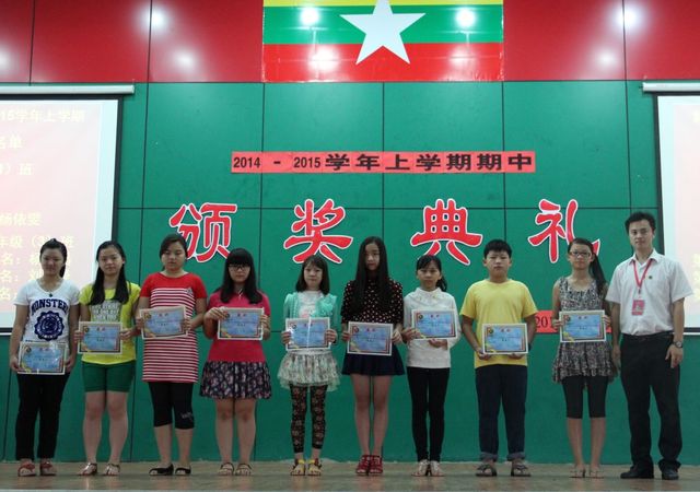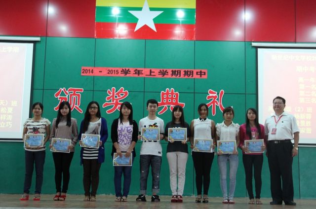 2014年11月6日上午,缅甸曼德勒新世纪学校隆重举行2014—2015学年上学期期中质量检测颁奖典礼,对本次期中检测中取得优异成绩的同学进行表彰。