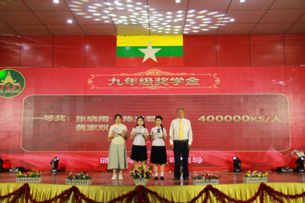 紧接着,教学主任杨旭冬公布了本届毕业生的总分前三名及升学奖学金获奖名单,奖学金从3万缅币至40万缅币不等,学前班程家瑛、杨有佳获得一等奖学金;杨本沛、刘金娜获得二等奖学金;廖明乐、刘克强、黄娅萍、沈万西、尹媛媛、施贵婷、李本构、刘永轩、米洋洋、娄文欣、何礼棵、明恩悦、李本花获得三等奖学金。六年级番佳佳、陈成、赵紫淇荣获一等奖学金;朱丽雯、黄诗琪获得二等奖学金;黄明灿、尹昭儿、苏复顺、岳希长、谷从嘉获得三等奖学金。九年级张晓雨、陈兴君、黄家双荣获一等奖学金;杨馨睿、晏祥博荣获二等奖学金;张永茜、番怡嫣、姜思绮、赵启惠荣获三等奖学金。
