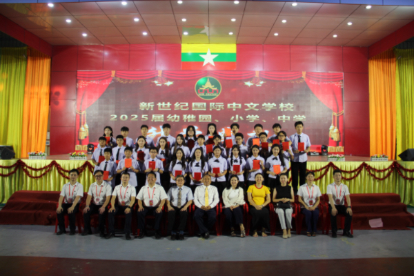 8月26日下午,缅甸新世纪(CPEC)国际中文学校曼德勒校区隆重举行2025届学前、小学、初中毕业升学典礼。董事长张旺后,副董事长张仰辉、李春兴,董事张丽彬、张丽华、张丽清,校长张继及全校师生齐聚一堂,共同见证这一重要时刻。典礼由六年级学生赵紫淇、李绪昂和九年级学生杨馨睿、张永茜主持。