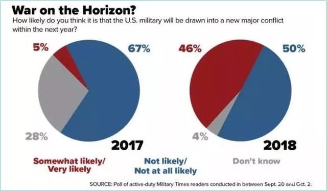 而在去年9月,《军事时报》也做过类似的调查,那时只有5%的士兵认为会有战争风险。只是1年时间,美军内部已经紧张起来。