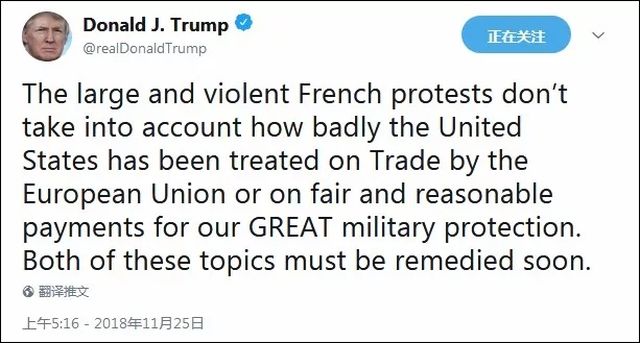 近日,为抗议政府出台的上调汽油及柴油税政策,法国近期接连爆发2场大规模民众示威活动。在马克龙焦头烂额之际,特朗普不忘落井下石。