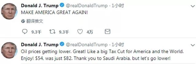 上周特朗普坦言:“现在油价很好。我不会因为愚蠢地对待沙特而摧毁世界经济,摧毁我们国家的经济。”然后他又发了多条推特庆祝。