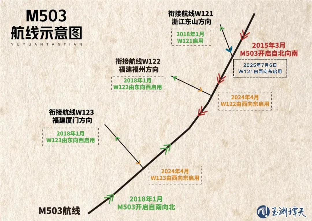 就在7月6日,民航局宣布启用M503航线的W121衔接线。这段线,是将浙江东山方向也接入M503主航线。至此,M503主线和三条衔接线实现全线双向贯通,M503航线最后一块拼图已接上。