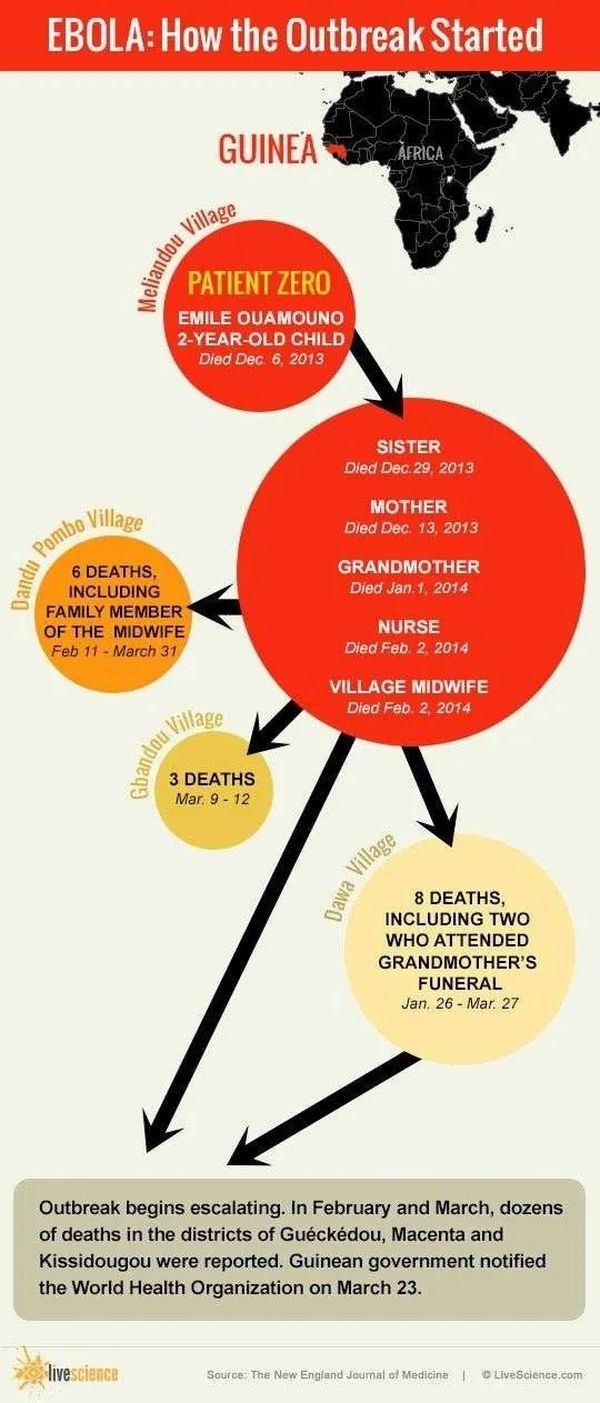西班牙《万象》月刊曾发表题为《零号病人》的文章称,埃博拉疫情的源头是2013年12月在几内亚盖凯杜行政区的梅利扬杜瓦村为两岁男童埃米尔举行的葬礼,这名男童也因此被定义为埃博拉疫情的“指示病例”。随后“多米诺骨牌效应”逐渐显现。参加葬礼的人将病毒传播到非洲其他国家。