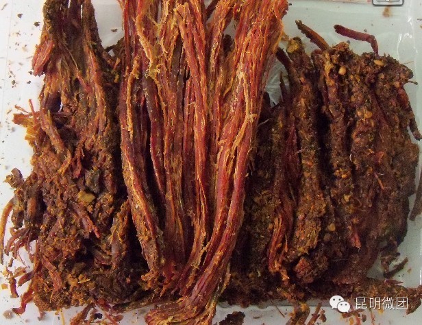 傣味火烧牛干巴,傣味干巴分为两种,一种是烤熟后用木槌打散打松后用手撕着吃,这种干巴耐嚼,味道香,另外一种是下面这种。