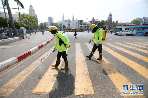 3月29日,在缅甸仰光,志愿者在消毒路面。新华社发(吴昂 摄)