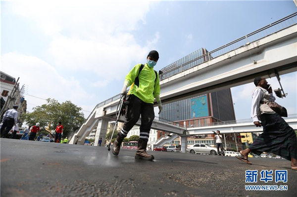 3月29日,在缅甸仰光,一名志愿者在消毒路面。新华社发(吴昂 摄)