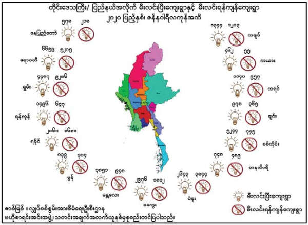 《缅甸之光》报4月3日发表了一组图表,介绍缅甸各省邦地区已通电的乡村总数。以下是有关具体数据: