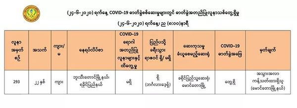 至此,缅甸国内新冠病毒确诊人数增加至293人。