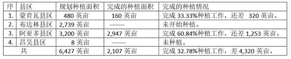 蒙育瓦专区内的四个县区:蒙育瓦县区、布达林(Budalin)县区、阿亚多(Ayadaw)县区及昌吴(Chaung-U)县区在现财年规划种植的夏芝麻种植面积及目前完成的种植面积如下表: