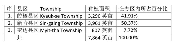 据6月12日出版的《缅甸之光报》报导,曼德勒省皎栖(Kyaukse)专区当地民众们主要从事农耕工作,专区内就种植了各种庄稼作物。在现财政年度夏末雨初季节期间,不少农村地区就种植了雨前绿豆这一作物7,864英亩,这是由专区农田暨地产税务局方面获知的数据资料。目前这雨前绿豆作物正在茁壮成长,专区内各县区所种植的雨前绿豆面积如下表: