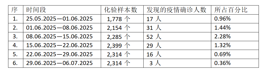 卫生部于7月7日晚上8点发出公告,在6月29日晚上8点是直到7月6日晚上8时这一周时间内,对839个化验样本进行检测,发现了3名新冠疫情确诊者。