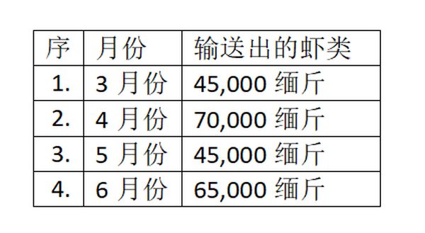 博加礼县区从事这水产品交易工作的经纪所人员、企业家等,在采购好本地生产出来的包括此虾类的各种水产品主要就是输送往仰光大都市的市场出售。在5月份期间也曾向仰光大都市的市场输送出45,000缅斤的虾类,在6月1日至30日这一整个月期间又再输送出65,000缅斤,比上个月多输出20,000缅斤了。