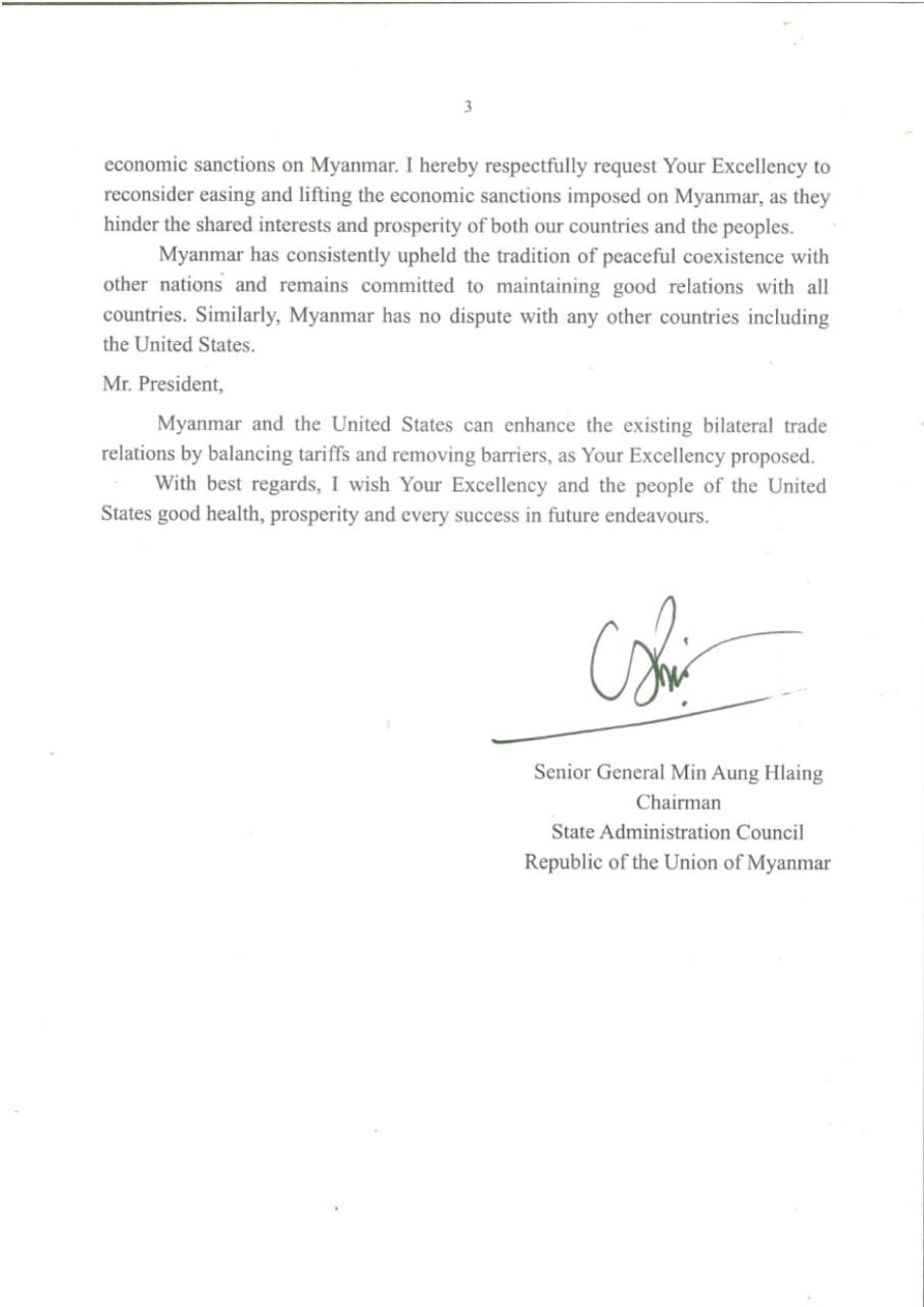 最后,信函重申缅甸愿与美国加强经贸合作,建议双方尽快派高级别代表团就关税调整等事宜进行磋商,共同推动双边贸易平衡发展。敏昂莱大将向特朗普总统及美国人民致以诚挚问候,祝愿美国在未来发展中取得更大成就。