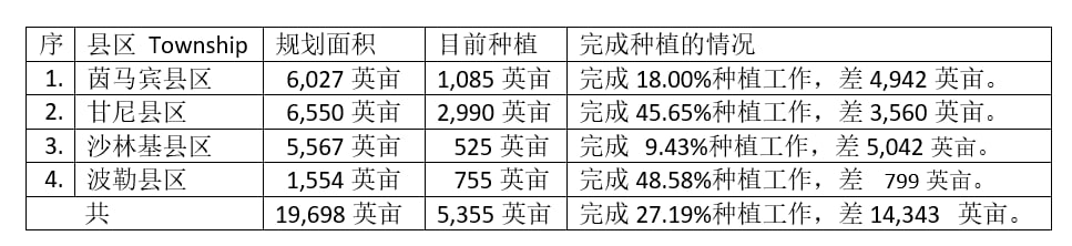 茵马宾专区内的4个县区—茵马宾县区、甘尼(Kani)县区、沙林基(Sa-lin-gyi)县区及波勒(Pale)县区今年雨季所规划种植的雨蔬菜面积及目前完成的实际种植的面积如下表: