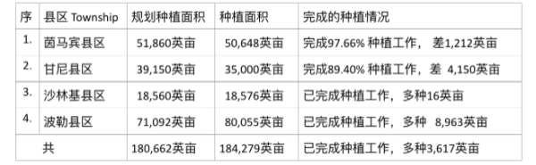 茵马宾专区内的四个县区为:茵马宾县区、甘尼(Kani)县区、沙林基(Salingyi)县区及波勒(Pale)县区,各县区规划的雨芝麻种植面积及目前所完成的种植面积如下表: