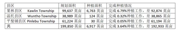 按:之前媒体上也报导过果林专区内的3个县区雨季稻种植情况(见《缅华网》7月17日“缅甸新闻”栏目中的有关报导)。专区内各县区的雨季稻规划种植面积及当时完成的种植面积如下表:
