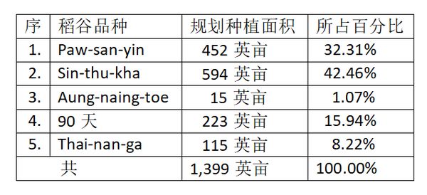 规划种植的几种稻谷品种中,以Sin-thu-kha稻谷品种规划面积为最多,占所有稻田规划面积的五分之二以上的比例,其次是Paw-san-yin稻谷品种,其规划种植面积约占稻田总面积的三分之一的比例。