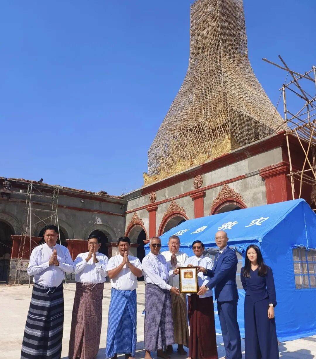 12月19日,中国驻曼德勒总领事馆张巍副总领事出席临沧市政府援助曼德勒马哈牟尼佛塔100顶震后应急救灾帐篷交接仪式。马哈牟尼佛塔管理委员会主席吴谬温及相关成员出席。