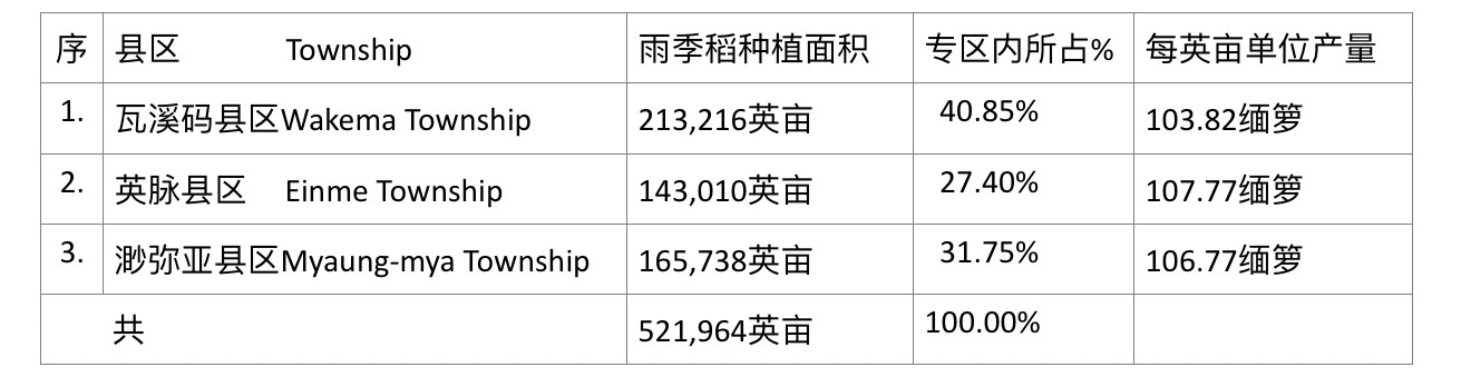 按:英脉县区是伊洛瓦底省内一重要的农业县,该县区所在的渺弥亚专区在雨季时期就种植了雨季稻 52万多英亩。现在的2025—26财政年度雨作物种植季节期间该专区内的各县区种植的雨季稻如下: