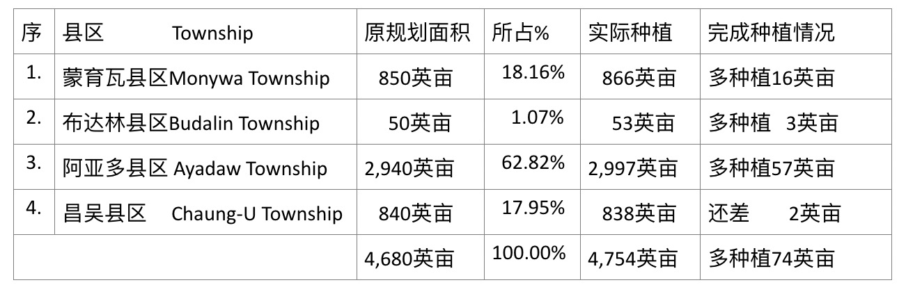 按:黑麦豆是缅甸第一大出口豆类,全国各地都广泛种植此豆类。今年冬作物种植季节期间,蒙育瓦专区原规划种植4,680英亩黑麦豆,现在种植4,754英亩。各县区原规划的种植面积及现在实际种植面积如下表: