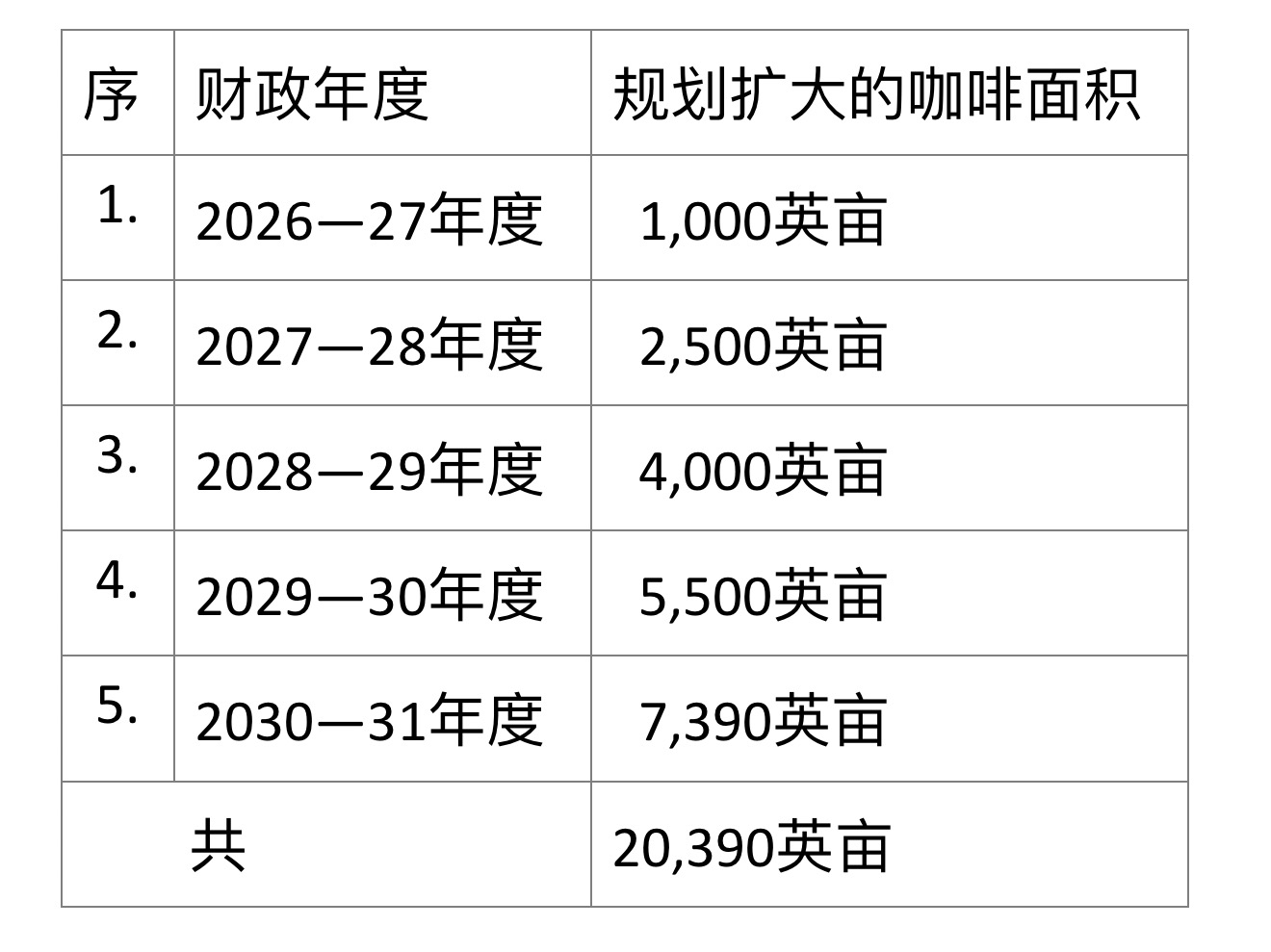 自2026—27财政年度开始,仰光省将逐年扩大种植这罗布斯塔咖啡作物,直到2030—31财政年度全省咖啡种植面积将达到20,390英亩。