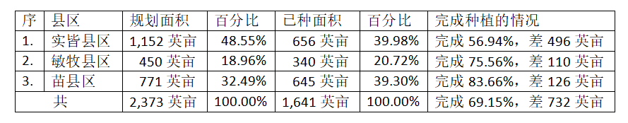 专区内各县区规划种植的胡椒面积及目前完成的种植面积如下表: