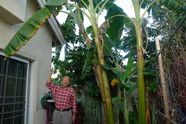 洛杉矶苏明堂家后院香蕉丛生收成在望