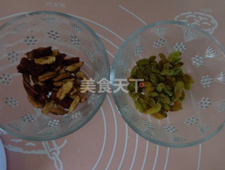 3枣和葡萄干洗净,擦干,枣用厨房剪刀剪成条状,去掉枣核