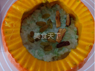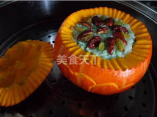 8再放一层米饭,摆上葡萄干和枣,直到填满黄金瓜