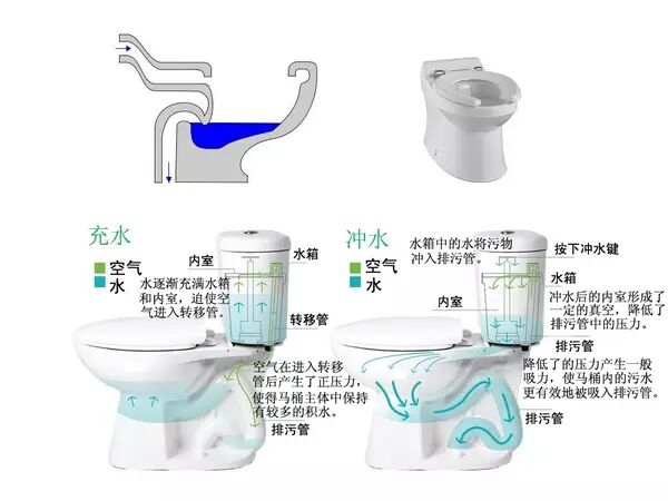 图1。3种不同的马桶类型。左上为最初的冲水马桶,右上为无马桶盖的“无框式”马桶。下为最常见的“虹吸式”马桶以及其工作原理 (图片来自网络)。