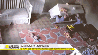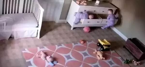 一对两岁的双胞胎在玩耍时,衣柜突然砸落!两人双双被砸在了抽屉柜之下!