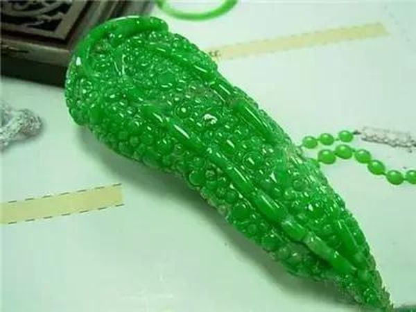 你缓过劲来了吗?透过不怎么清楚的照片,都能看出这些个翡翠饰品算得上是比较好的翡翠了,颜色很辣,而且很多块料子水头还不错,直接达到戒面级别。虽然雕工很一般,但光是这样的种水,这个包包就价值不菲了。