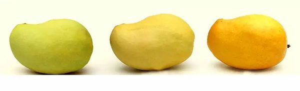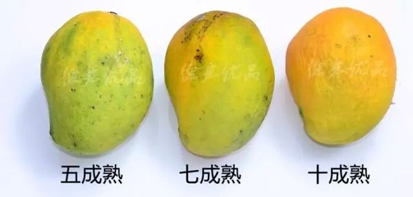 无催熟剂的芒果成青色(考虑到运输时间的问题,种植户一般会在芒果八成熟的时候采摘),经过7—10天左右一箱芒果会分先后慢慢变成金黄色,13—15天以后芒果皮起皱(此时仍可食用,但水分略有下降)。